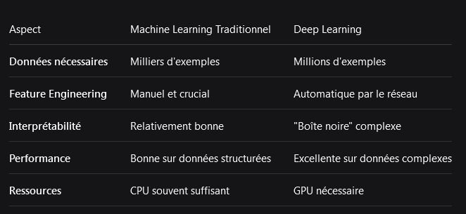 Analogie : Au lieu d'apprendre à un enfant à reconnaître un chat en lui donnant une liste de règles (oreilles pointues, moustaches...), vous lui montrez des milliers de photos de chats et de non-chats. Son cerveau apprendra par lui-même les caractéristiques d'un chat.