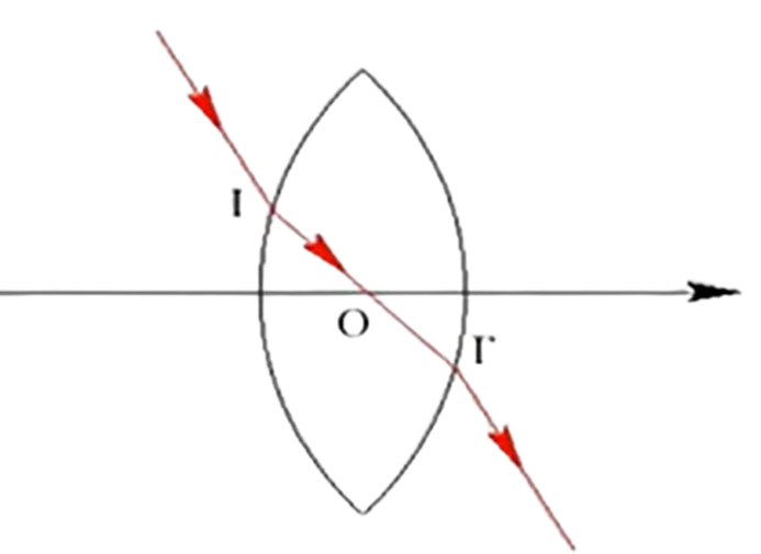 The optical center of a lens is defined as a point on the principal axis such that any incident ray passing through this point emerges parallel to its initial direction.