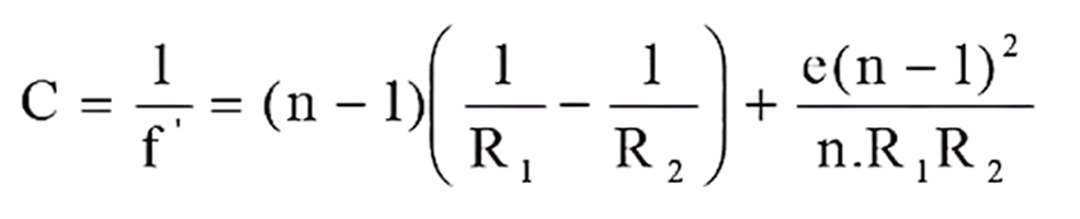 The lens has radii of curvature R1=S1C1 and R2=S2C2 for the two diopters that form the lens.