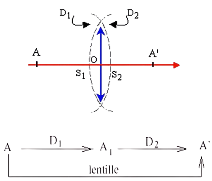 Let us consider a thin lens as the combination of two diopters D1 and D2, and a real point A on the principal axis.