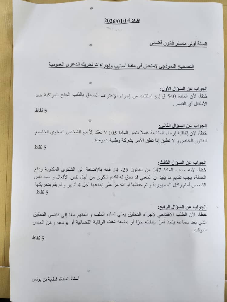 2. يعلم الاتاذ قطاية الطلبة الذين يريدون الاطلاع على ورقة الامتحان أنه موجود على مستوى الكلية يوم الخميس المقبل 29 جانفي ابتداء من الساعة 09:00 بقسم القانون الخاص