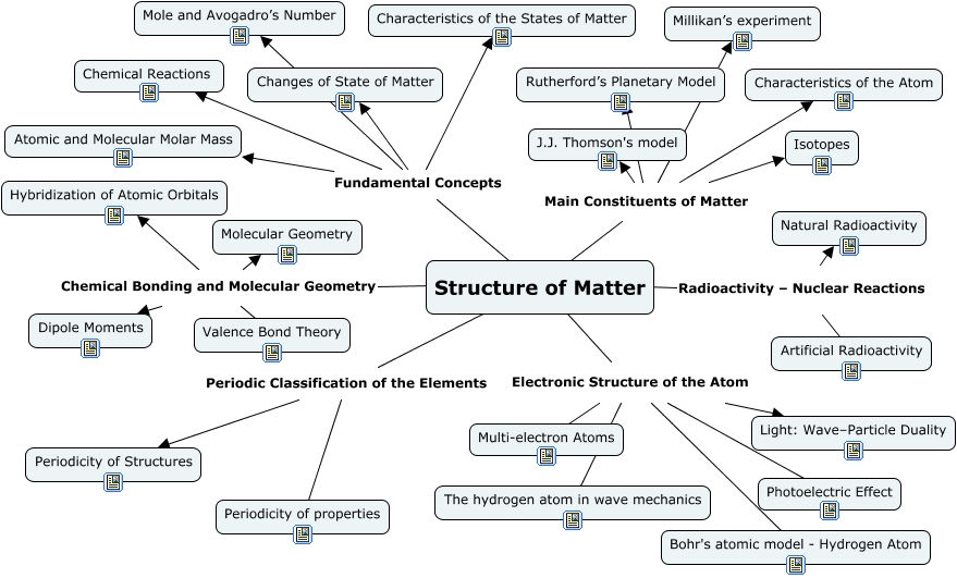 Cette carte de concepts créée avec IHMC CmapTools traite de: Structure_of_Matter_Course, Structure of Matter Electronic Structure of the Atom Photoelectric Effect, Structure of Matter Chemical Bonding and Molecular Geometry Hybridization of Atomic Orbitals, Structure of Matter Fundamental Concepts Characteristics of the States of Matter, Structure of Matter Electronic Structure of the Atom The hydrogen atom in wave mechanics, Structure of Matter Electronic Structure of the Atom Bohr's atomic model - Hydrogen Atom, Structure of Matter Periodic Classification of the Elements Periodicity of Structures, Structure of Matter Main Constituents of Matter Rutherford’s Planetary Model, Structure of Matter Main Constituents of Matter J.J. Thomson's model, Structure of Matter Radioactivity – Nuclear Reactions Artificial Radioactivity, Structure of Matter Radioactivity – Nuclear Reactions Natural Radioactivity, Structure of Matter Chemical Bonding and Molecular Geometry Molecular Geometry, Structure of Matter Periodic Classification of the Elements Periodicity of properties, Structure of Matter Main Constituents of Matter Isotopes, Structure of Matter Chemical Bonding and Molecular Geometry Valence Bond Theory, Structure of Matter Fundamental Concepts Changes of State of Matter, Structure of Matter Main Constituents of Matter Characteristics of the Atom, Structure of Matter Main Constituents of Matter Millikan’s experiment, Structure of Matter Fundamental Concepts Atomic and Molecular Molar Mass, Structure of Matter Fundamental Concepts Chemical Reactions, Structure of Matter Electronic Structure of the Atom Light: Wave–Particle Duality
